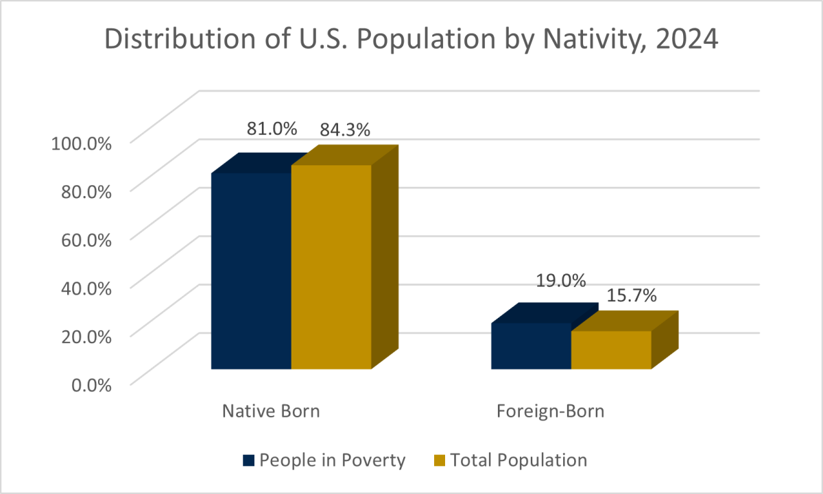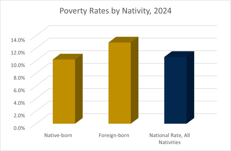 In 2024, the nation’s official poverty rate was 10.6%. Poverty rates by nativity ranged from 10.2% to 12.9%.