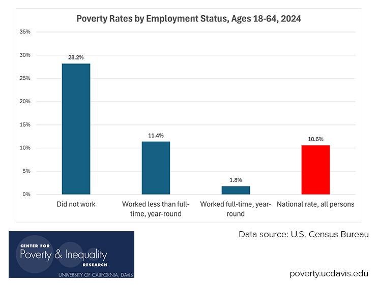 The Census Bureau reports poverty rates by work experience for people ages 18 to 64. In 2024, the overall poverty rate for people ages 18 to 64 was 9.6% (lower than the rate of 10.6% for all persons).