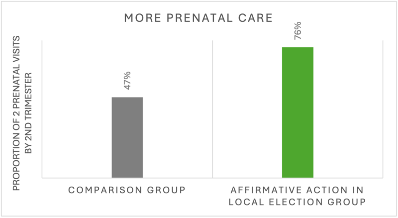 We found that village clusters with a mandate for affirmative action in the 2021 local elections showed better health outcomes in the years following the elections than did villages clusters without. Specifically, mandated clusters had lower infant mortality rates (IMR) and higher odds of two prenatal visits, two tetanus vaccinations, and prenatal supplement received by the second trimester. Mandated clusters did not, however, see improved test scores, and leaders elected in part via affirmative action reported more discrimination and more difficulty in working with teachers relative to health workers. Overall, affirmative action in local governments in India predicted greater infant survival and improved prenatal health services.