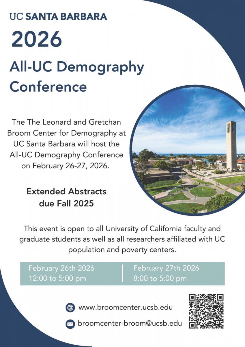 The Leonard and Gretchan Broom Center for Demography at UCSB now invites submissions for oral and poster presentations at the 2026 All-UC Demography Conference to be held on the UCSB campus, in the afternoon on Thursday, February 26th, and all day on Friday, February 27th.