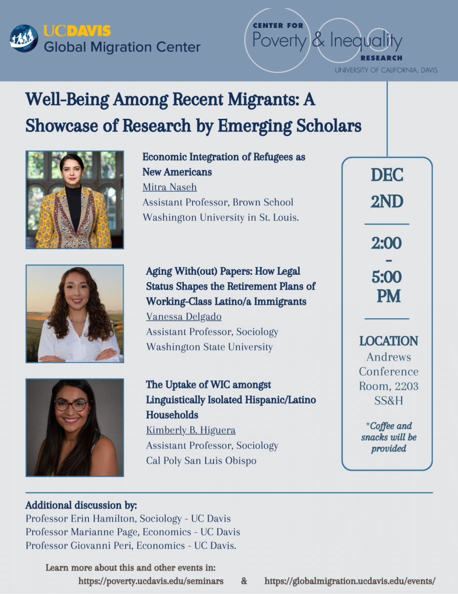 Join us for Well-Being Among Recent Migrants: A Showcase of Research by Emerging Scholars, a mini-conference hosted by the Center for Poverty & Inequality Research and the Global Migration Center. Three Institute for Research on Poverty Visiting Scholars will share their current research and engage in discussions with experts in the field.