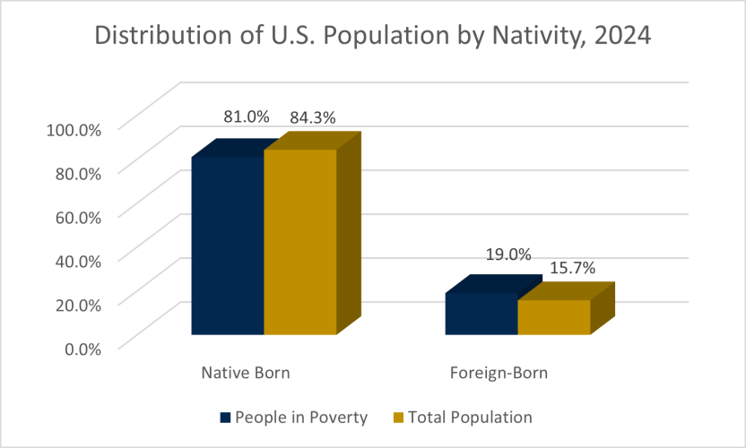 Another way to think about the relationship between poverty and nativity is to look at how the distribution of people in poverty by place of birth compares to that of the population as a whole.