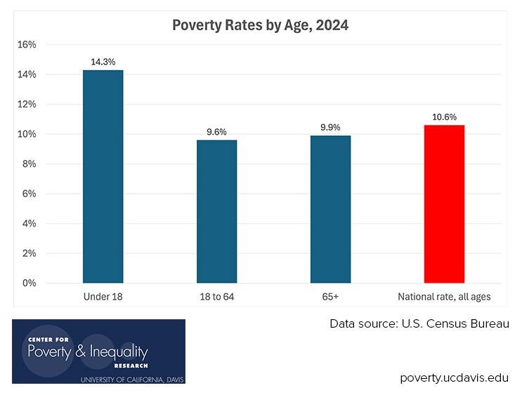 In 2024, the nation’s official poverty rate was 10.6%. The poverty rates by age groups ranged from 9.6% to 14.3%.