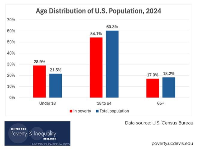 By that measure, in 2024 children comprise a greater share of the population in poverty than their share of the general population; while other age groups are underrepresented.