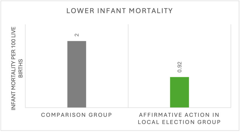 - Infant mortality rate was 54 percent lower in village clusters with affirmative action than in those without in the high-poverty state of Uttar Pradesh.