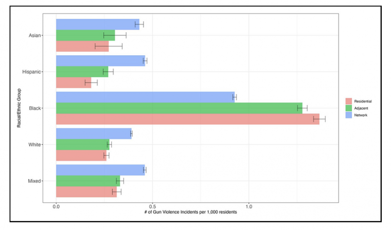 - Black neighborhoods exhibit greater gun-violence exposure across all scales, while segregation increases gun-violence exposure in neighborhood networks for Black, Hispanic and mixed racial/ethnic neighborhoods.